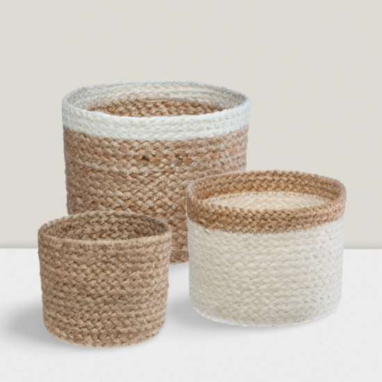 El precio original era: 7,60 €.6,08 €El precio actual es: 6,08 €.Set de 3 cestas de mimbre natural y blanco
