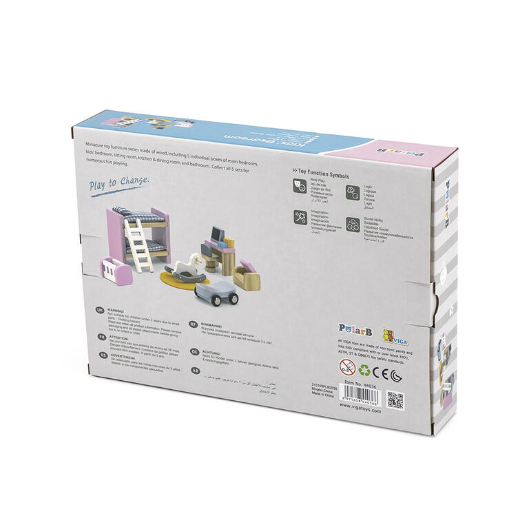 El set de muebles de madera para la habitación infantil de la casa de madera de PolarB tiene un diseño único que combina a la perfección con la estética de la casa de madera.