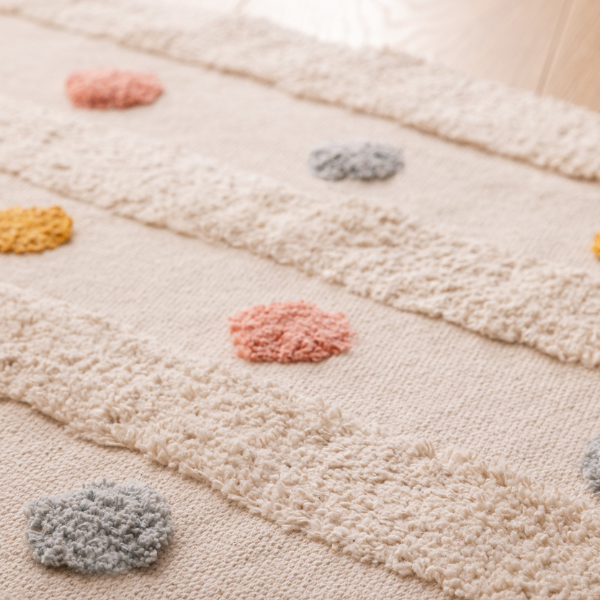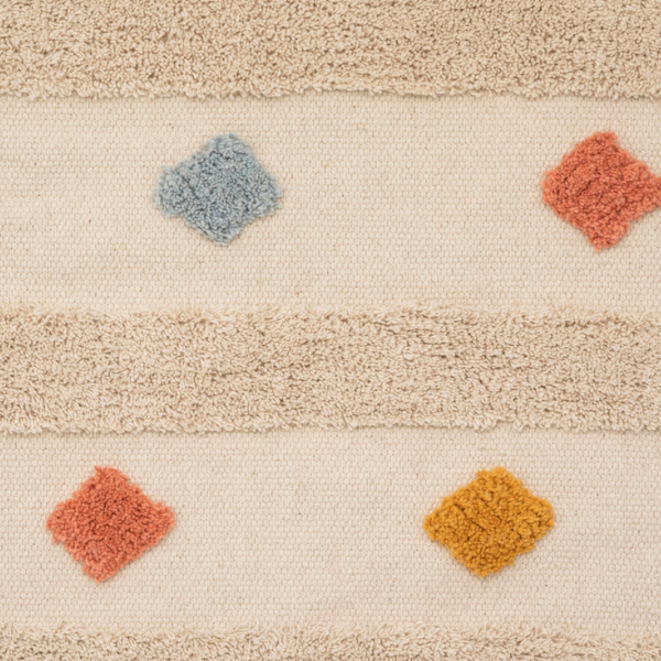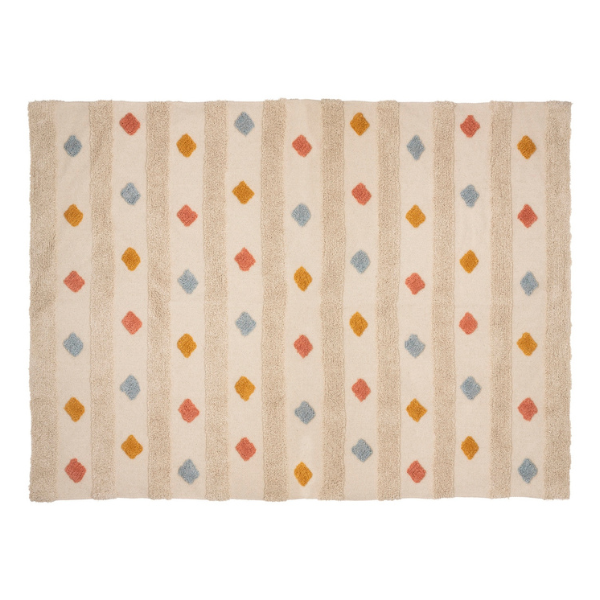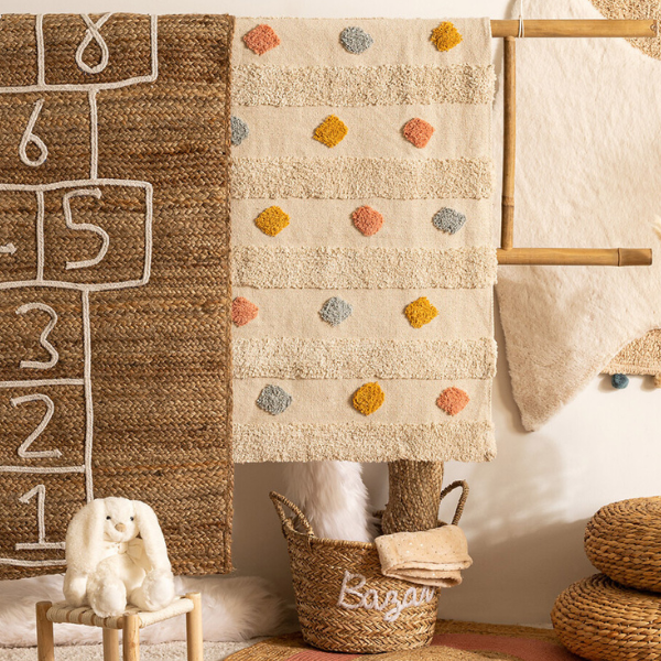 Realizada en algodón y con un alegre estampado étnico multicolor, esta alfombra llenará de luz y color las habitaciones de los más peques. Tiene un tamaño generoso donde también los más peques podrán jugar con sus juguetes favoritos o leer sus historias favoritas.