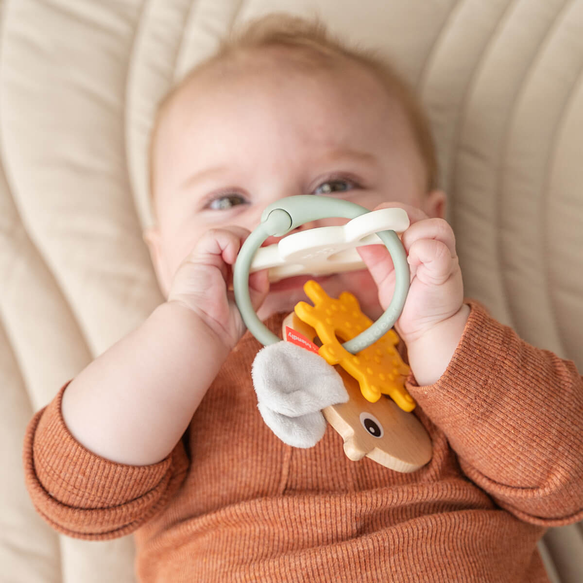 Anillo de actividades sensorial diseñado para despertar todos los sentidos de tu bebé con una variedad de texturas, colores y formas. Con Ozzo con alas de tela, una nube de silicona para morder con efecto “pop”, un sol con texturas y un agradable sonido de cascabel. Este juguete promueve la motricidad fina y la coordinación mano-ojo. Además las diferentes texturas proporcionarán alivio durante la dentición.