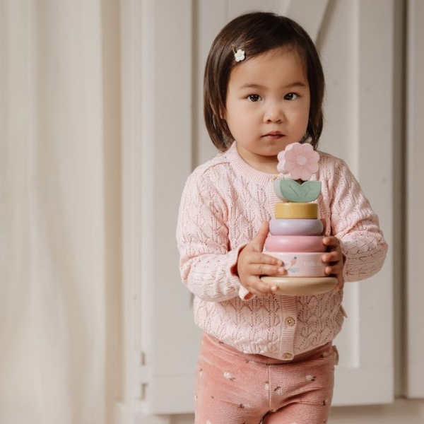 Este apilador de anillos de Little Dutch ofrece una experiencia de juego divertida y educativa. Los niños pueden desafiarse a sí mismos apilando los anillos en el orden correcto sobre la base balancín, coronando la torre con una flor. Es un juguete ideal para fomentar el desarrollo de habilidades motoras finas y la concentración en los más pequeños.