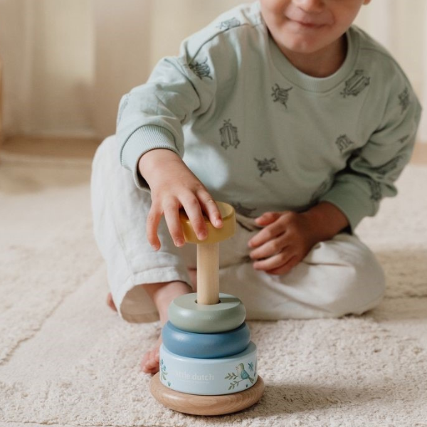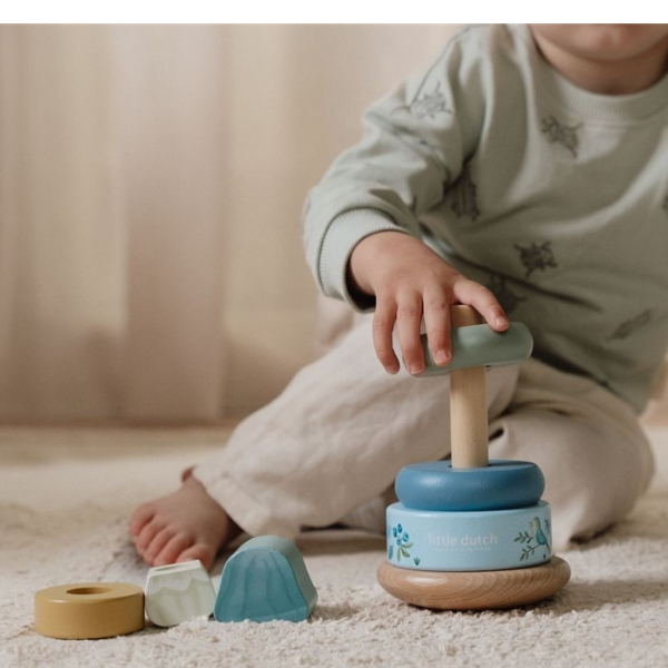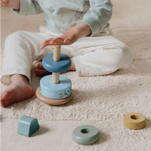 Este apilador de anillos de Little Dutch ofrece una experiencia de juego divertida y educativa. Los niños pueden desafiarse a sí mismos apilando los anillos en el orden correcto sobre la base balancín, coronando la torre con una flor. Es un juguete ideal para fomentar el desarrollo de habilidades motoras finas y la concentración en los más pequeños.