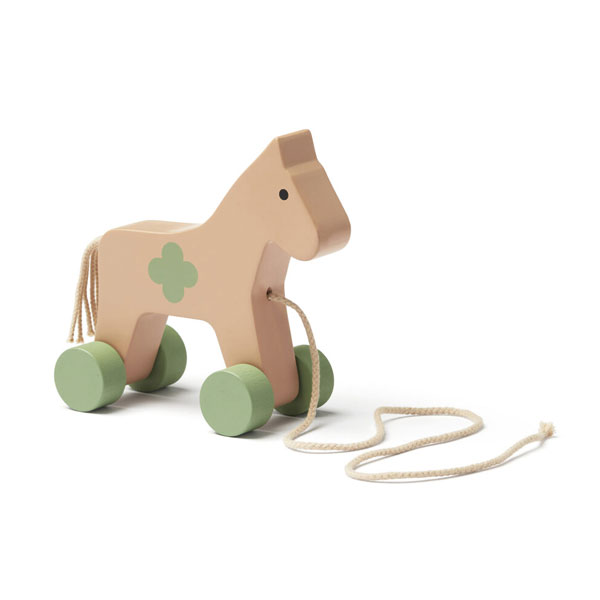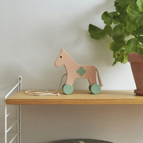 Un juguete de arrastre de la colección de Carl Larsson ideal para los niños que están aprendiendo a caminar y quieren llevar a su amigo de viaje. El caballo tiene una cuerda larga y una bonita cola hecha de unas cuantas cuerdas. Este caballito de madera tiene colores elegidos del estilo de diseño interior de Karin y Carl. A fines del siglo XIX, la hermana de Karin vivía en Londres, donde el rosa y el verde se usaban con frecuencia para la decoración. Karin se inspiró y eligió pintar ciertas paredes y molduras en este color rosa pálido y verde fresco. Puede encontrar un ejemplo de esto en la famosa obra de Carl “The Flower Window”. El patrón, que parece un trébol de cuatro hojas, aún se puede encontrar en sus interiores, que se conservan en su casa.