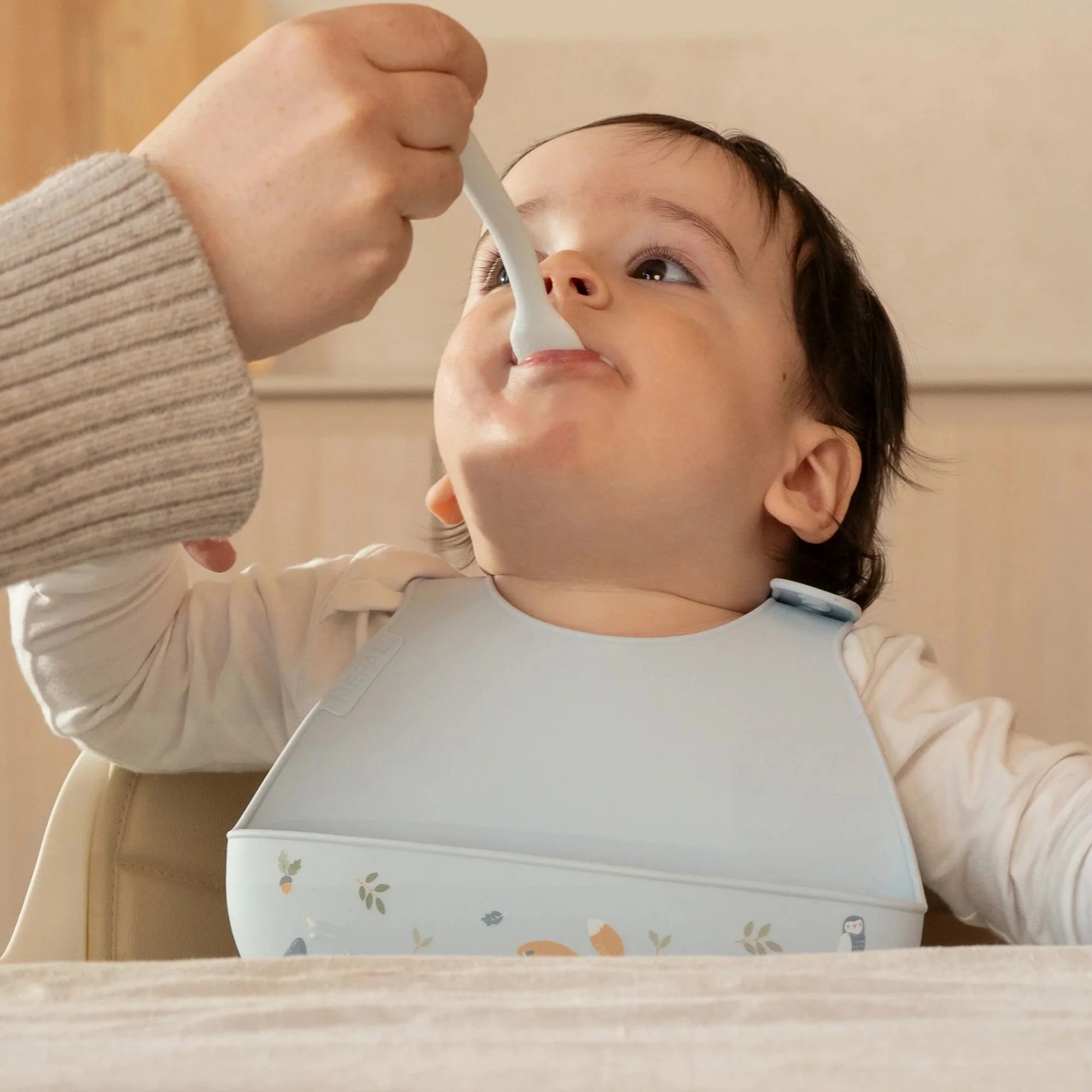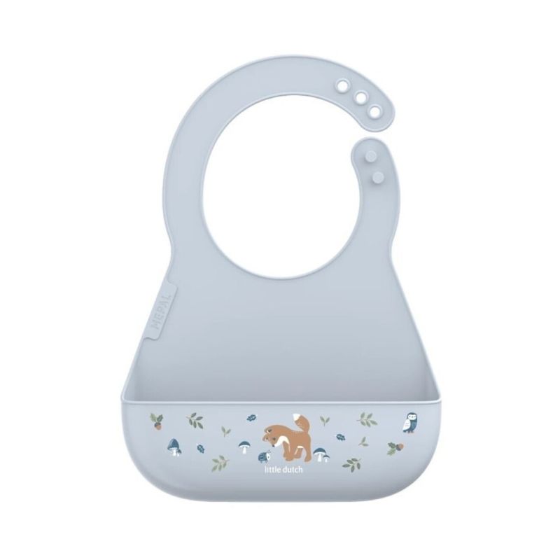 Babero de silicona, en color azul, con un precioso estampado de  animales del bosque. Cuenta con cierre ajustable en el cuello y un bolsillo para recoger los restos de comida, agilizando la limpieza.