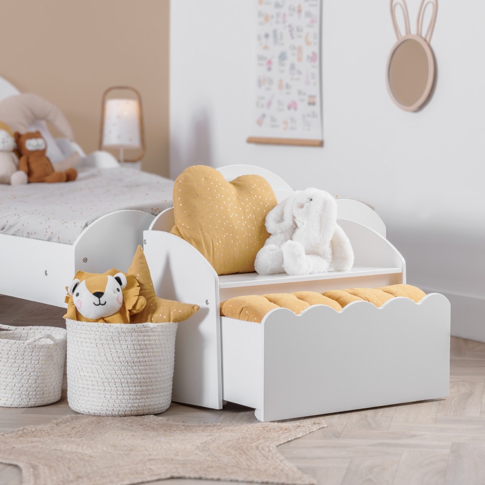 Banco con cajón para almacenar juguetes, peluches o ropita. Tiene la altura ideal para que tu peque se pueda sentar a descansar o a leer.
