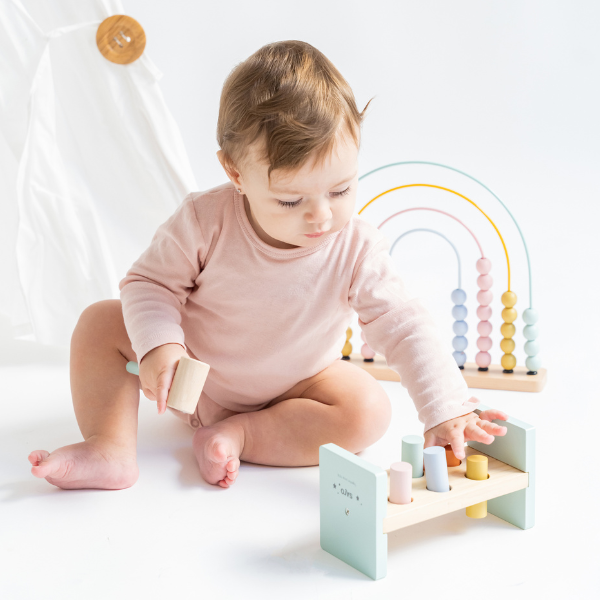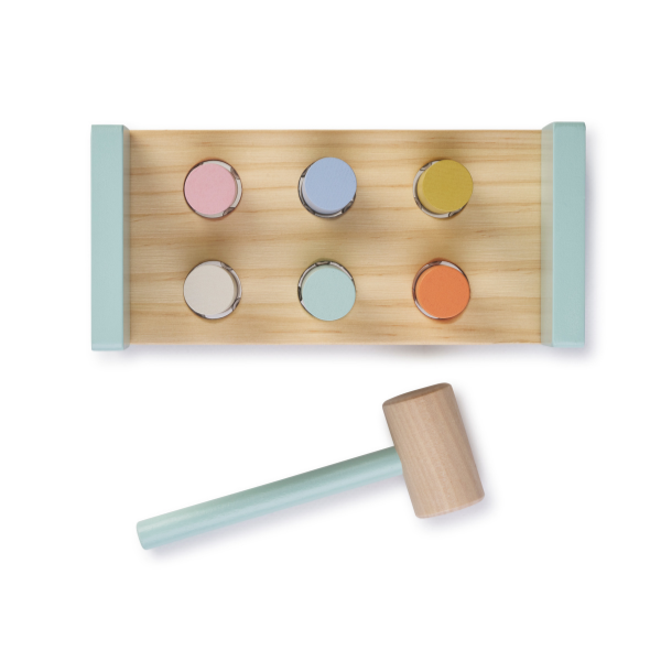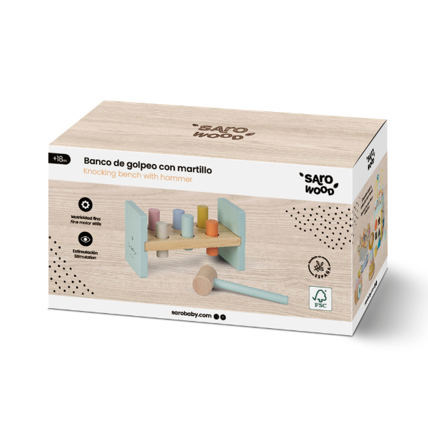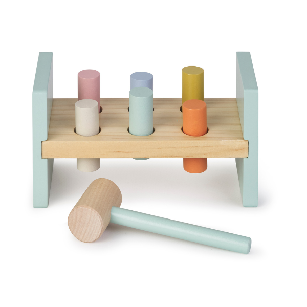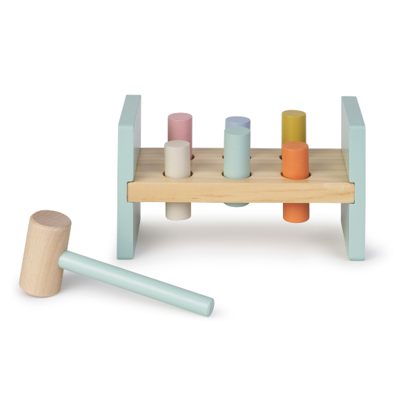 A tu peque le encantará este banco de madera compuesto por seis cilindros de distintos colores, que podrá golpear con un martillo de madera.