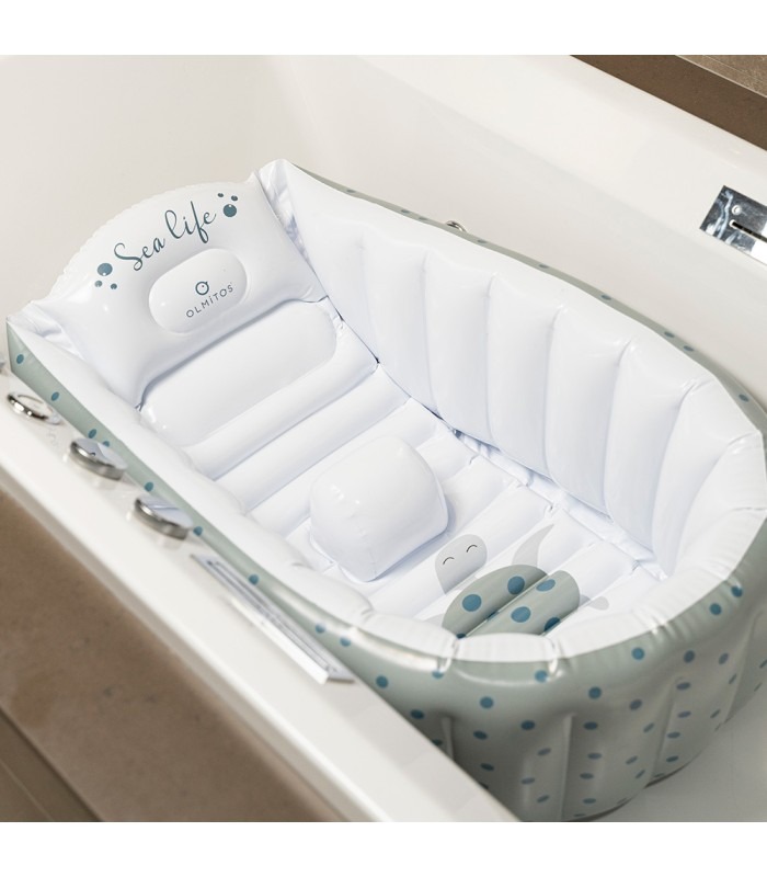 La bañera hinchable Olmitos es la solución perfecta para bañar al bebé con comodidad y seguridad desde su nacimiento hasta los 5 años.