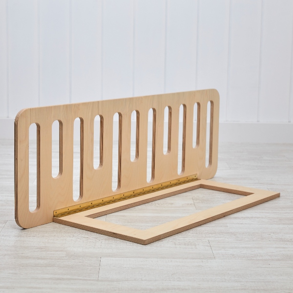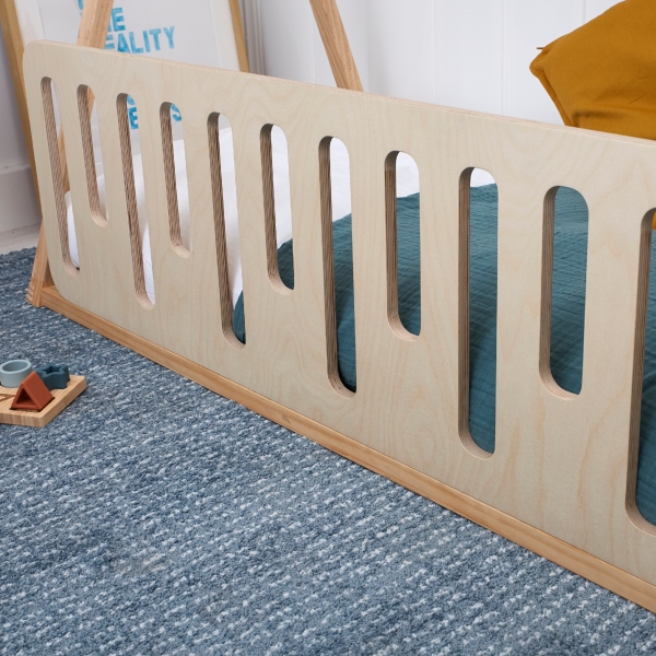 Para mejorar la transición de la cuna a la cama, puedes colocar la barrera de cama entre el somier y el colchón para aumentar la seguridad de los peques durante el sueño.
