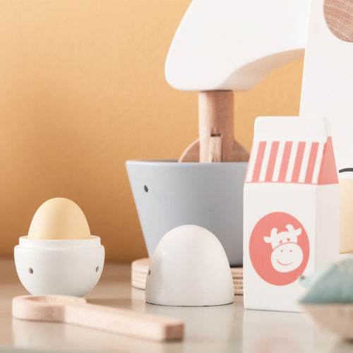 - Contiene: un cuenco, un huevo y dos paquetes de tela que representan harina y azúcar, así como una jarra de leche.