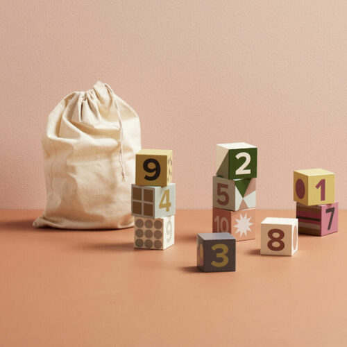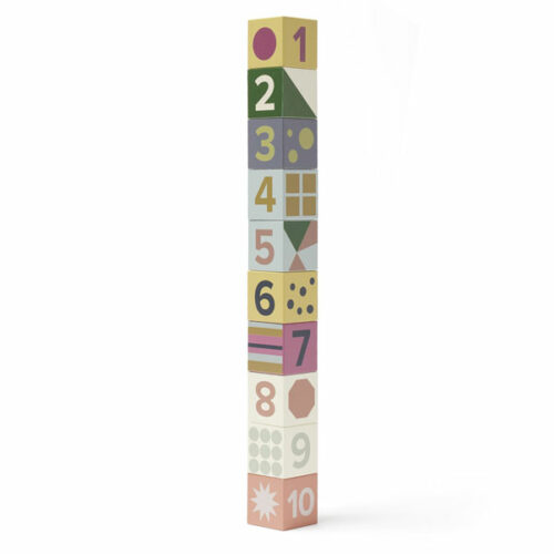 - 10 bloques de madera en colores suaves y con estampados. Los bloques están numerados del 1 al 10 con patrones y figuras en los lados con el mismo número que el número.