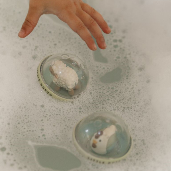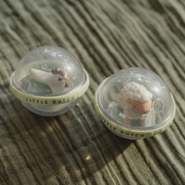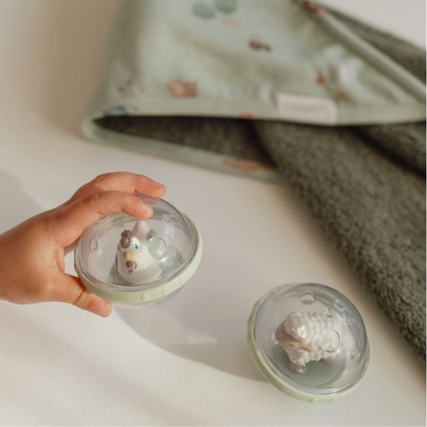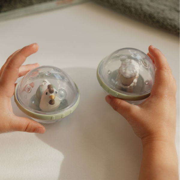 1, 2, 3 y a rodar. Estas bolas giratorias vienen acompañadas de dos amigos muy divertidos de la granja: una ovejita y una gallinita. Son perfectas para la hora del baño, ya que flotan en el agua. Su tamaño es ideal para las manos pequeñas y facilita un buen agarre.