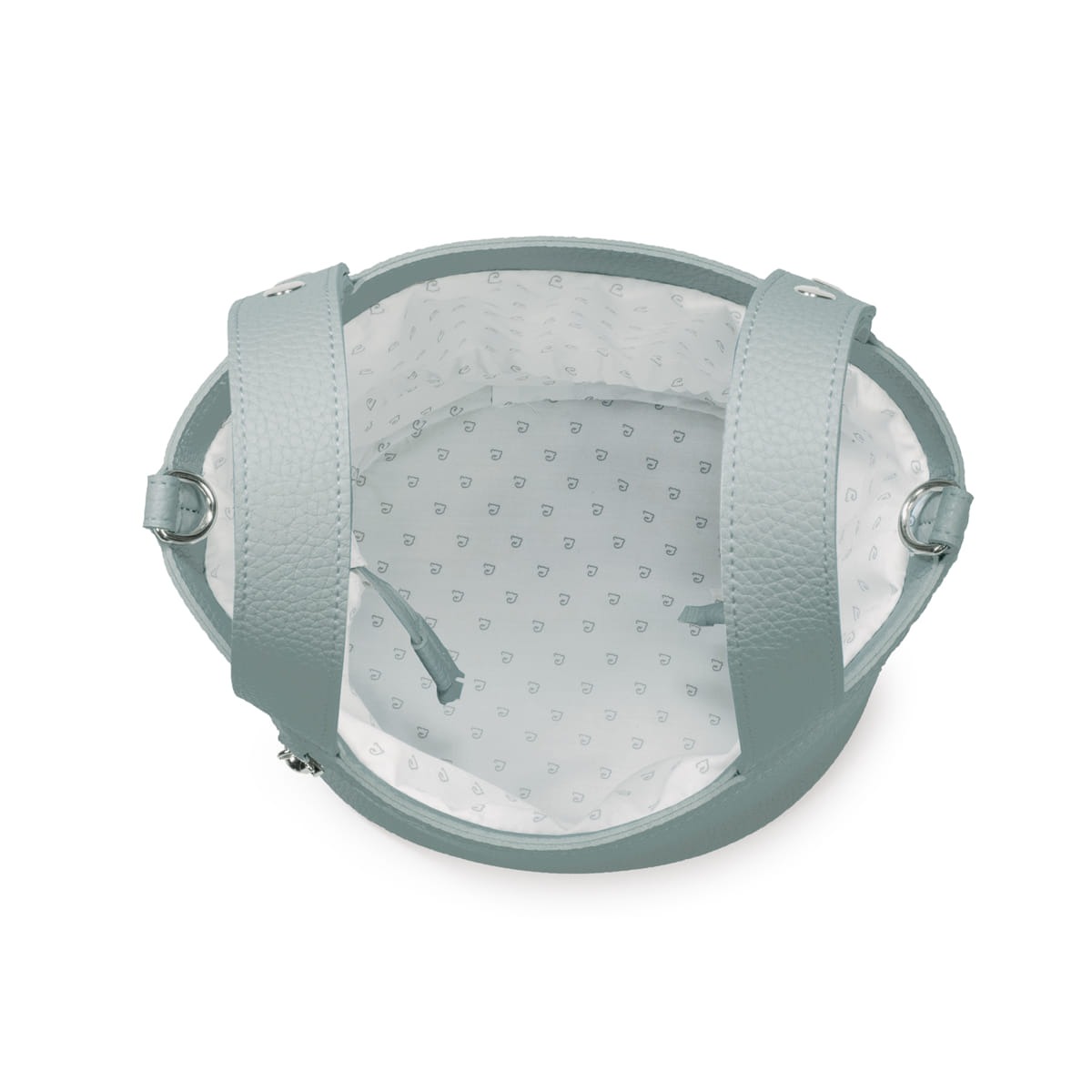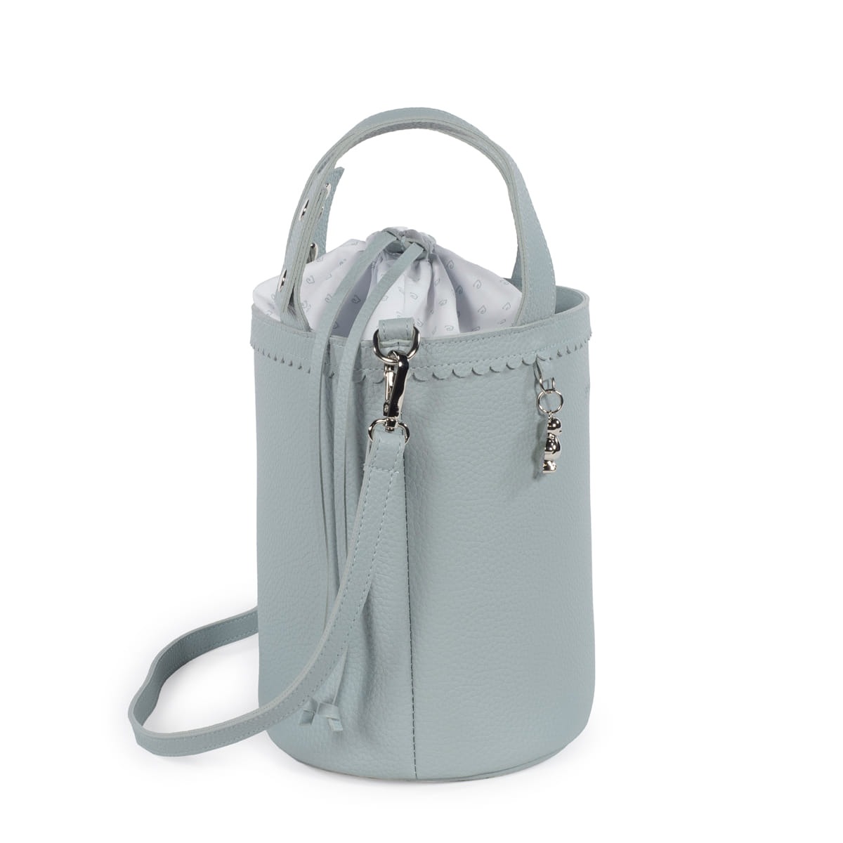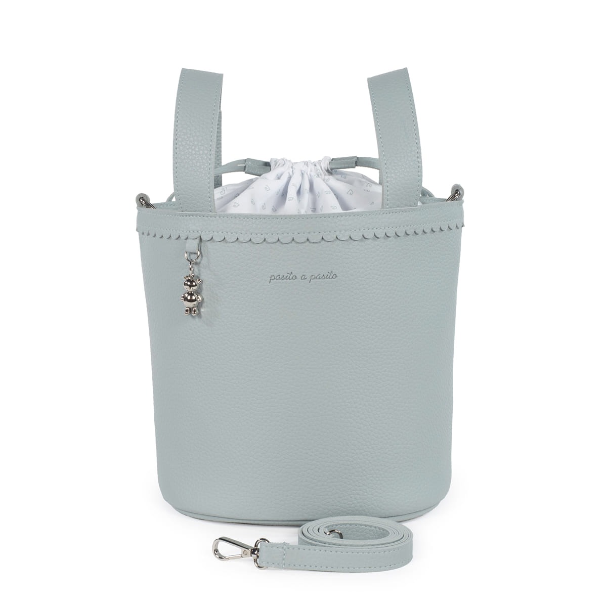 Bolso tipo bucket para carrito, confeccionado en polipiel de alta calidad. Su diseño cúbico, presenta un elegante borde festoneado y un  colgante metálico en forma de osito, que le da un toque especial. Este bolso es el complemento perfecto para llevar lo esencial del bebé con estilo y comodidad durante tus paseos. Su tamaño compacto, es ideal para organizar pañales, biberones y otros artículos necesarios, manteniéndolos siempre a mano. La bolsa cuenta con un práctico cierre tipo saco con cordón ajustable, que asegura tus pertenencias.