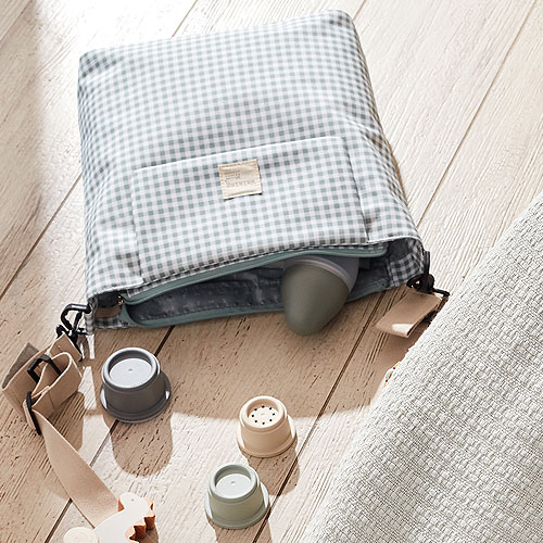 • Incluye asa larga para colgar en el cochecito y asas de mano.
