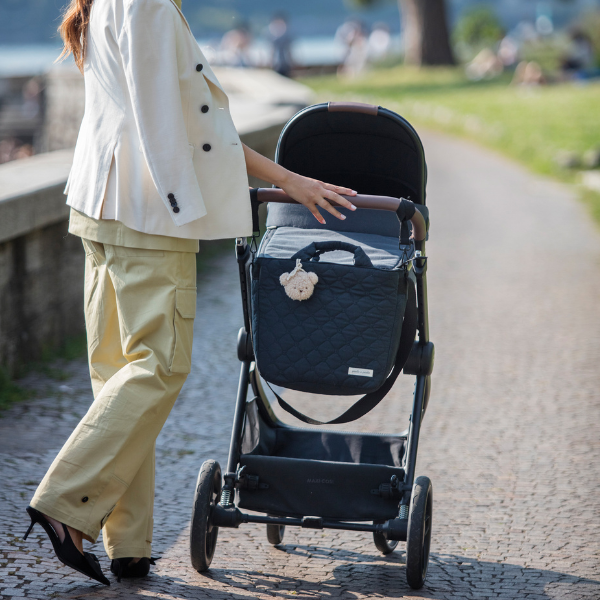 La bolsa canastilla para carrito de bebé o el bolso para silla de paseo, está realizada en un resistente material acolchado. Tiene un diseño muy elegante y práctico con una gran capacidad para llevar todo lo que necesita tu bebé a la hora de salir de casa. Dispone de bolsillos interiores para poder colocar de forma ordenada el biberón, cubiertos, pañales o productos de aseo. Además entre los bolsillos uno de ellos es térmico para guardar el biberón y otro está plastificado para guardar prendas húmedas o mojadas.