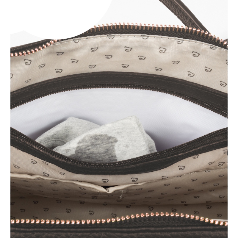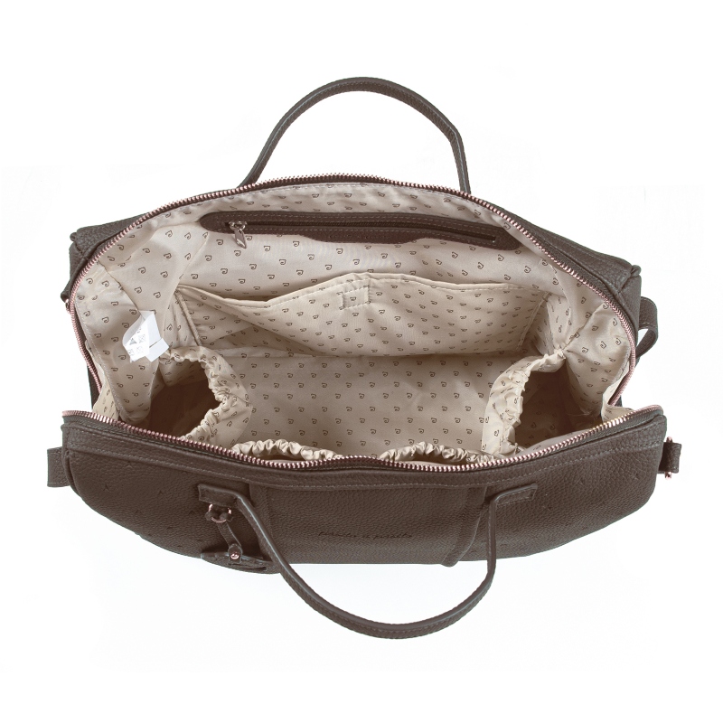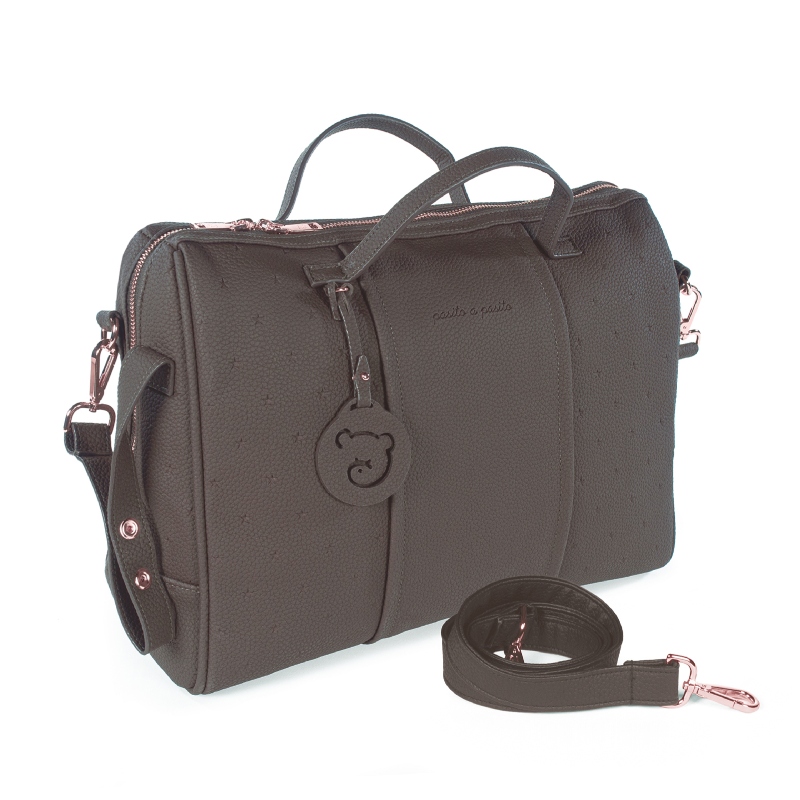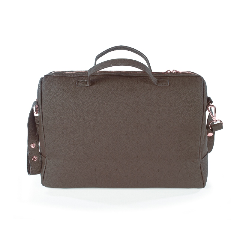 Bolsa maternal o bolso para silla de paseo  en polipiel marrón con estrellas grabadas. Es elegante y práctica. Su gran capacidad te permitirá llevar todo lo necesario para ti y tu bebé. Incluye un bolsillo interior plastificado, donde podrás guardar la ropita húmeda o mojada.