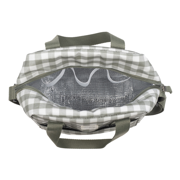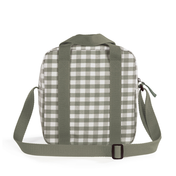 Bolsa térmica para llevar biberones, con estampado de cuadros en color verde.