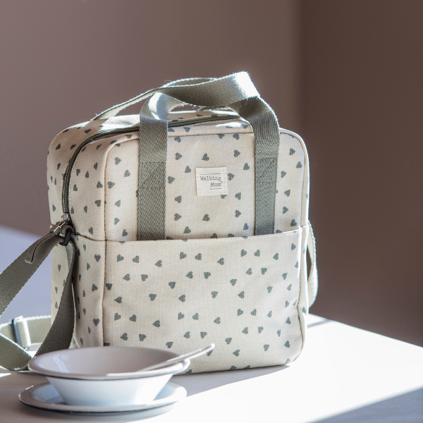 Bolsa térmica para llevar biberones con corazones en color verde musgo en tono beige.