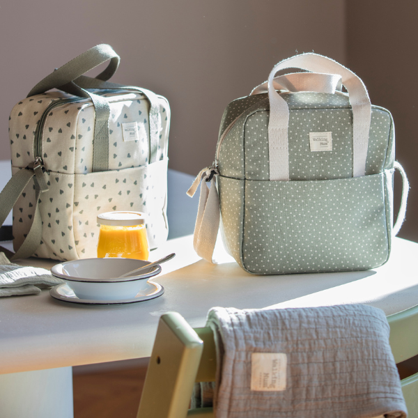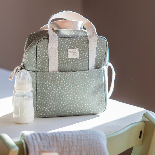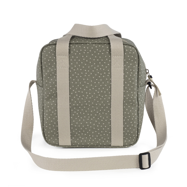 Bolsa térmica para llevar biberones con topitos en color beige en tono verde musgo.