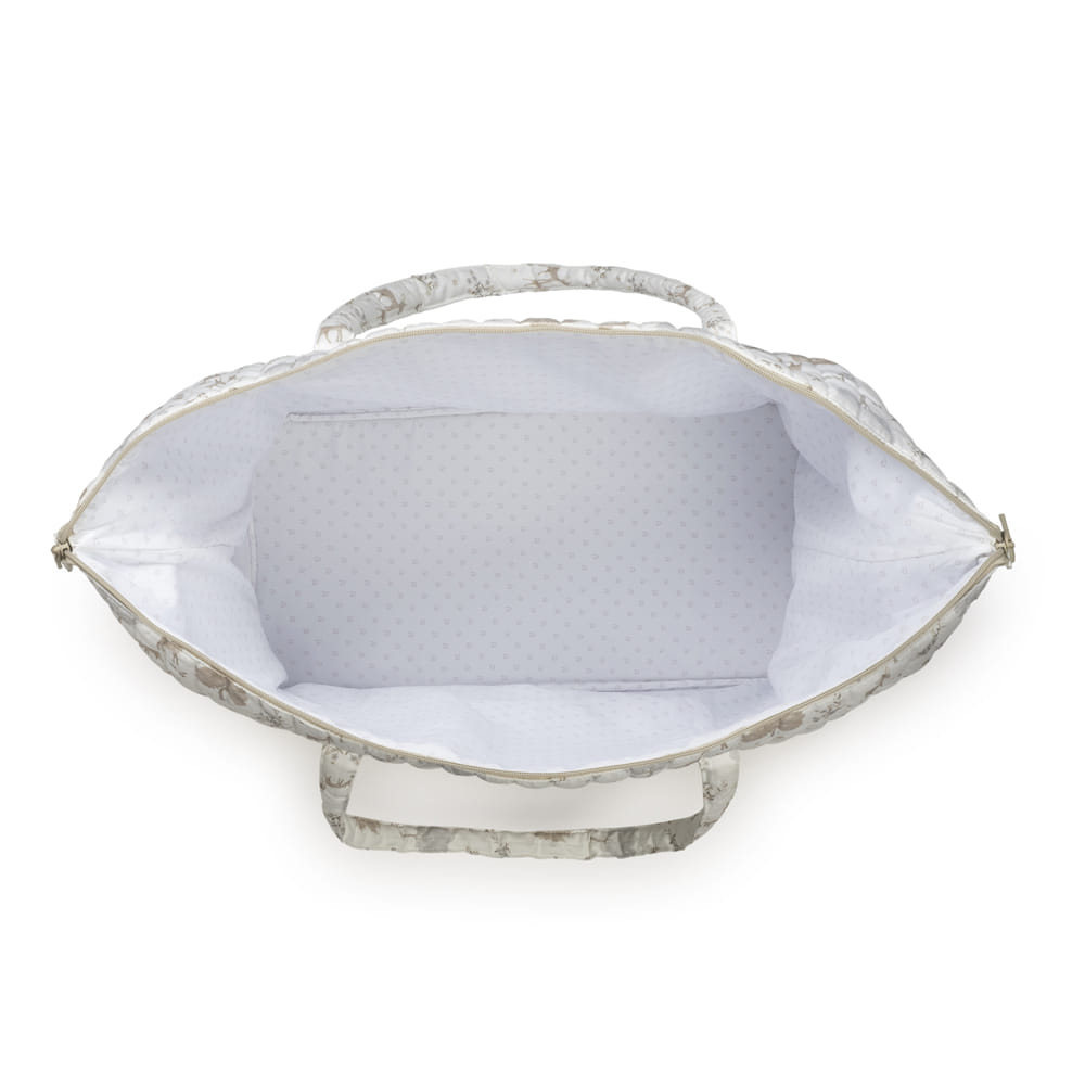 La Bolsa XL Nara de Pasito a Pasito combina estilo y practicidad, confeccionada en loneta de algodón 100% con un delicado estampado de ciervos y árboles en tonos neutros.