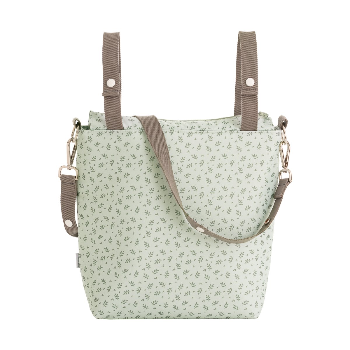 Este bolso lleva 2 asas que se abrochan con clips para poder colgarlo en el carro, y un asa bandolera, para poder colgarse del hombro.