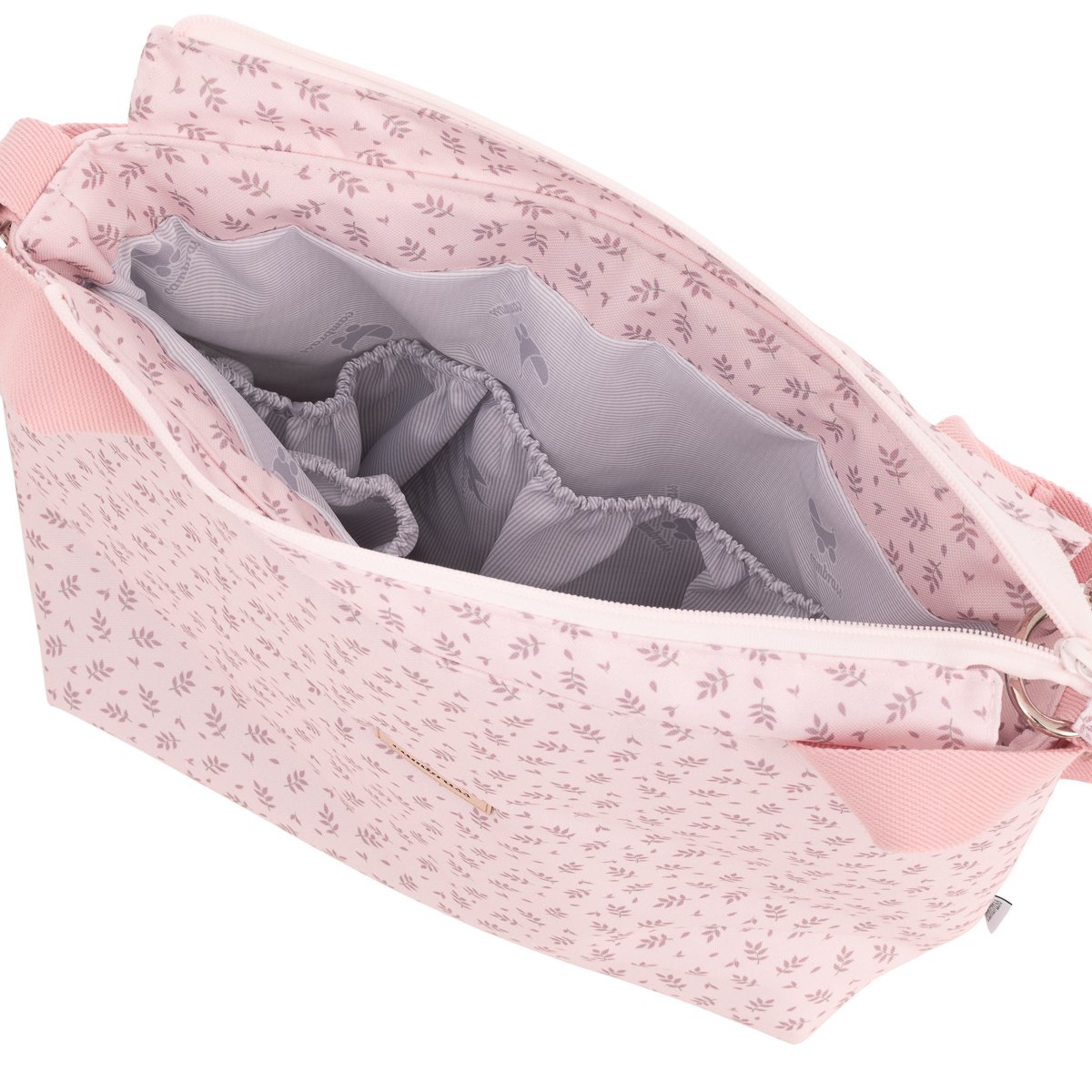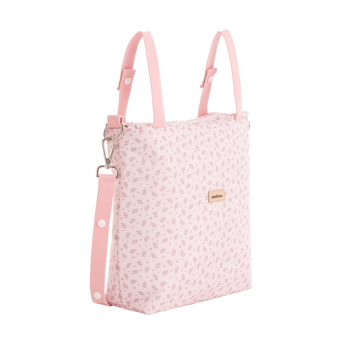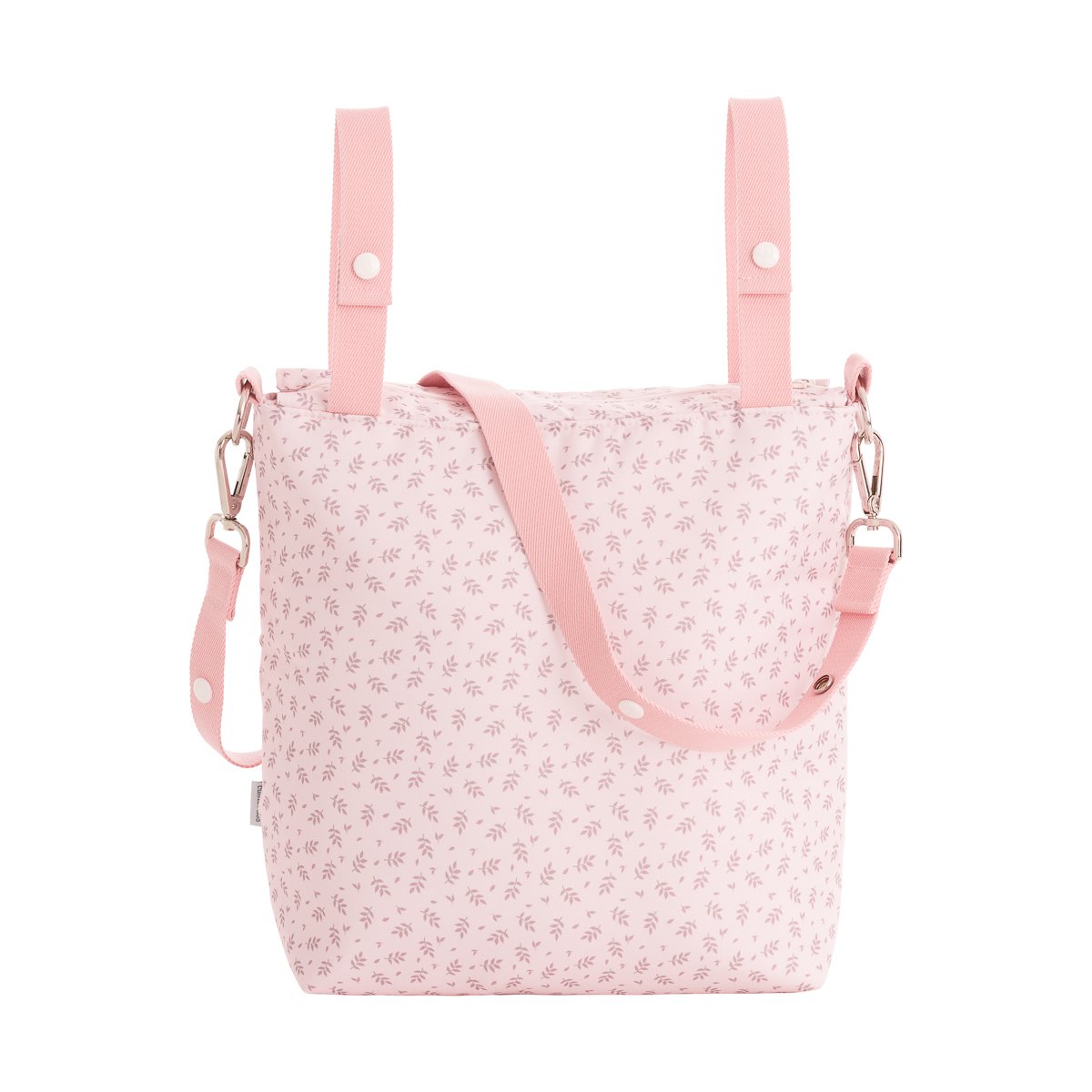 Este bolso lleva 2 asas que se abrochan con clips para poder colgarlo en el carro, y un asa bandolera, para poder colgarse del hombro.