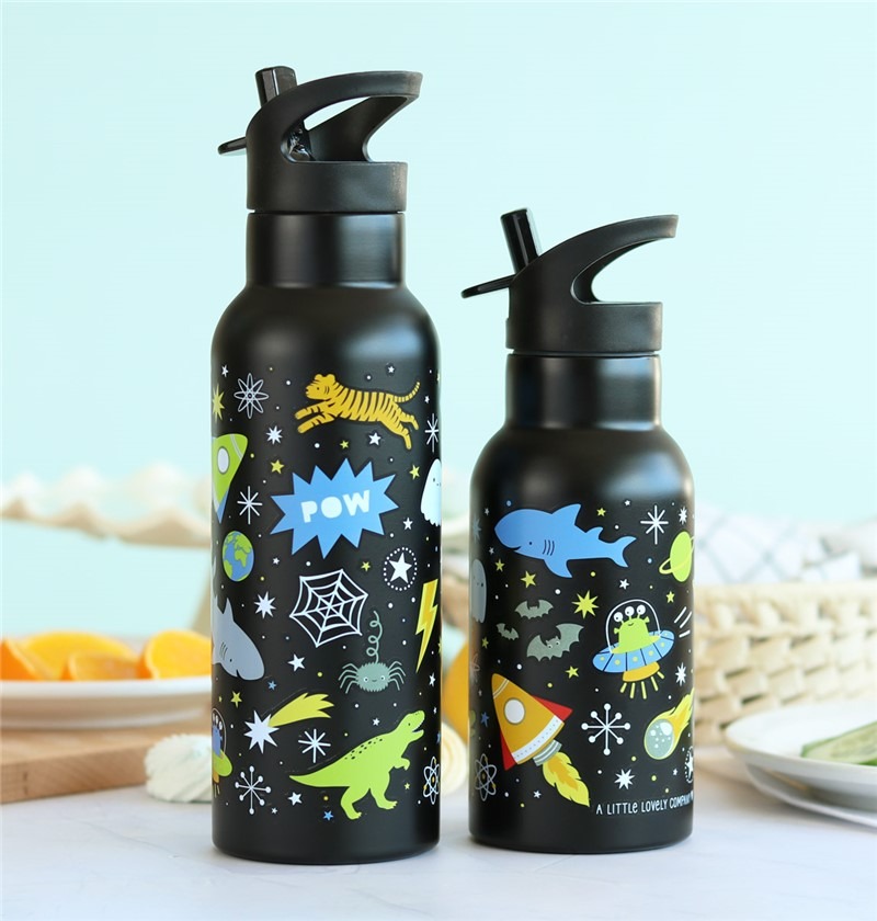 Esta botella ligera de acero inoxidable es perfecta para llevar a la escuela y mantener las bebidas frías durante más tiempo gracias a su doble pared aislante.