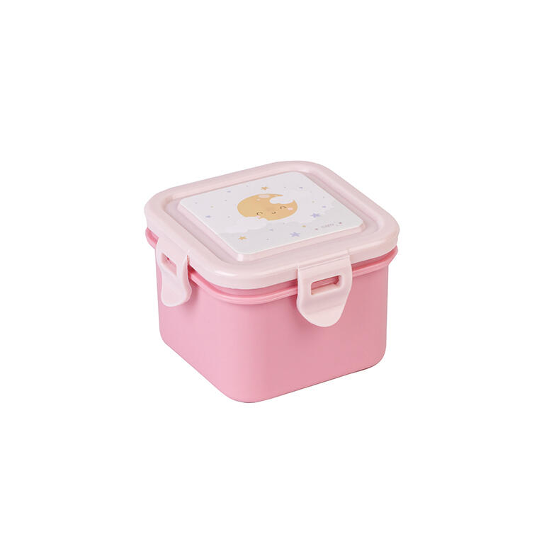 Cajita de tamaño pequeño, ideal para llevar snacks al colegio, a la guardería o al parque. La tapa tiene 4 cierres en forma de clic muy fáciles de abrir y cerrar para los peques.