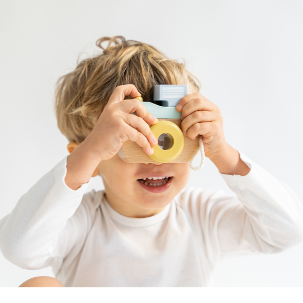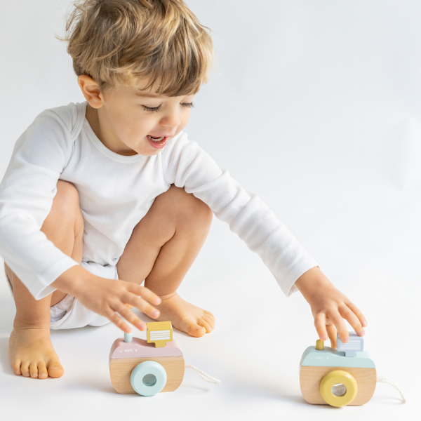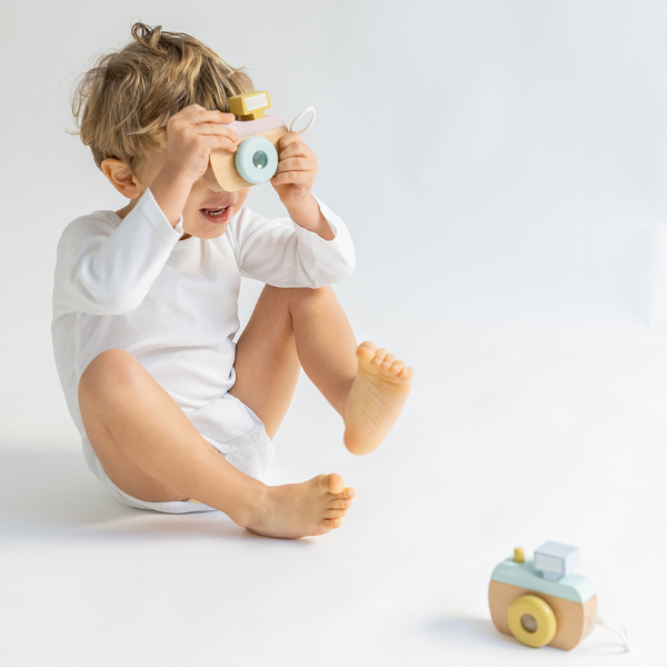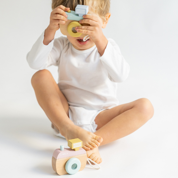 Say chesee! a tu peque le encantará fotografiar todo a su alrededor con esta divertida cámara de madera. Y es que al mirar por el objetivo giratorio, podrá descubrir un caleidoscopio con el que verá el mundo de una manera fascinante.