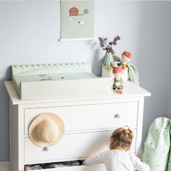 Cambiador plastificado estampado con medidor para que puedas medir a tu bebé. Podrás usarlo en cualquier superficie lisa y adaptarlo a una cómoda.