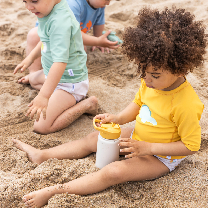 El uso de este bañador no sustituye jamás el uso de crema protectora y se debe de evitar la exposición solar del niño entre las horas en que el sol está en su punto más álgido.