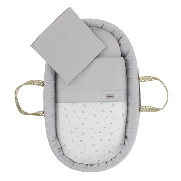 - Incluye: capazo de mimbre, colchón, colcha, cojín de 30x30cm y vestidura.