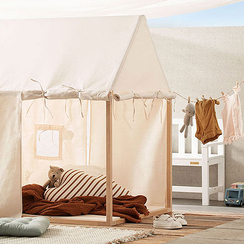 Casita de juegos llena de posiblidades gracias a que sus cuatro lados pueden recogerse y da origen a distintas configuraciones.