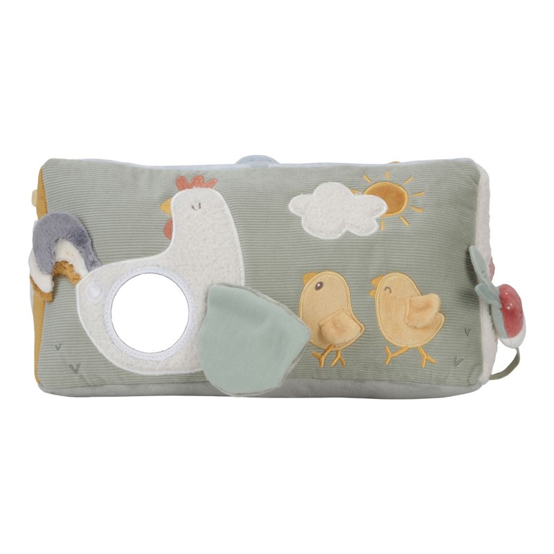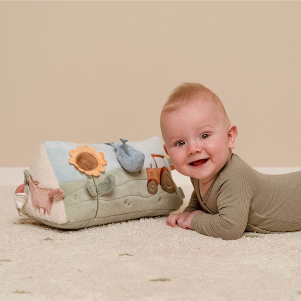 Este cojín está repleto de juegos y texturas que atraerán los sentidos y la imaginación del bebé.