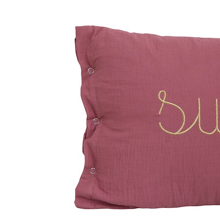 Cojín con forma rectangular en color old rose, con la palabra “sweet” bordada en color dorado. Ideal para decorar la habitación de los peques.
