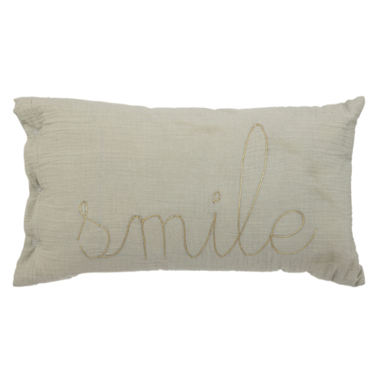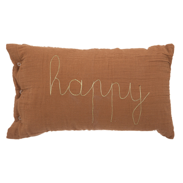 Cojín con forma rectangular en color marrón, con la palabra “happy” bordada en color dorado. Ideal para decorar la habitación de los peques.