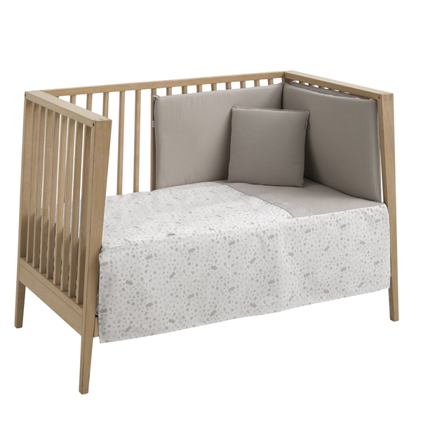 Juego de dos piezas para vestir la cuna, compuesto por una colcha para invierno y verano más un protector, e incluye un bonito cojín bordado. La colcha, diseñada para vestir la cuna, brinda protección contra el frío actuando como una manta o una funda nórdica. Gracias a su relleno desmontable, es una prenda versátil que puede utilizarse tanto en invierno como en verano, y además, se puede lavar con facilidad. El protector, confeccionado con un tejido acolchado con fibra hueca, ayuda a amortiguar posibles golpes del bebé contra la cuna.