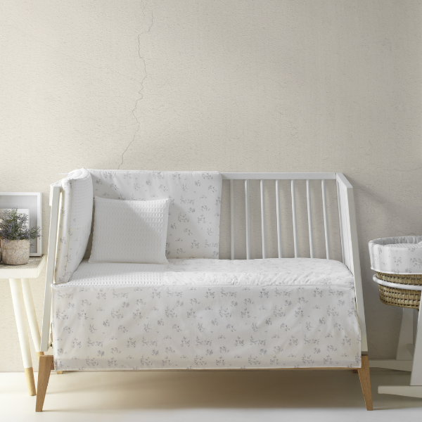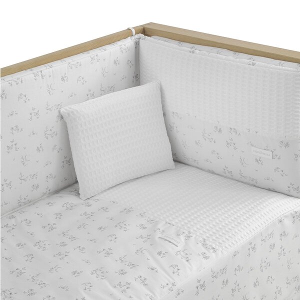 Juego de dos piezas para vestir la cuna, compuesto por una colcha para invierno y verano más un protector, e incluye un bonito cojín bordado. La colcha, diseñada para vestir la cuna, brinda protección contra el frío actuando como una manta o una funda nórdica. Gracias a su relleno desmontable, es una prenda versátil que puede utilizarse tanto en invierno como en verano, y además, se puede lavar con facilidad. El protector, confeccionado con un tejido acolchado con fibra hueca, ayuda a amortiguar posibles golpes del bebé contra la cuna.