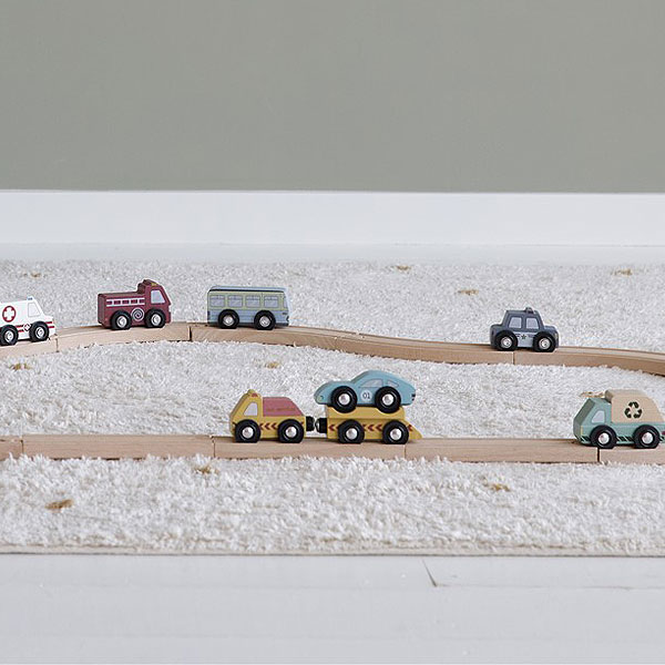 • Incluye 2 autobuses, 1 camión de correos, 1 camión de reciclaje, 1 ambulancia, 1 camión de bomberos, 1 coche de policía y un camión con remolque y bólido.