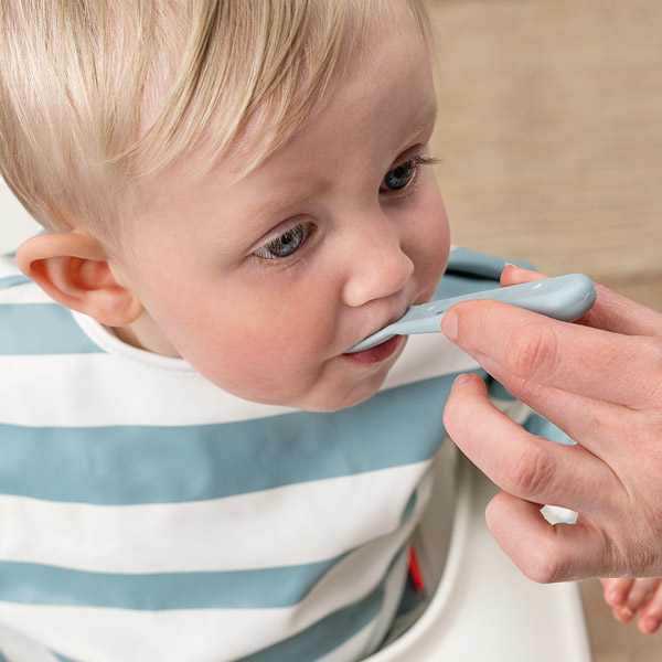 Set de cubiertos en color azul, con divertidos puntos, diseñados para adaptarse a las manitas de los más pequeños. Los bordes de los cubiertos son redondeados, suaves y seguros para que los peques empiecen a comer solitos.