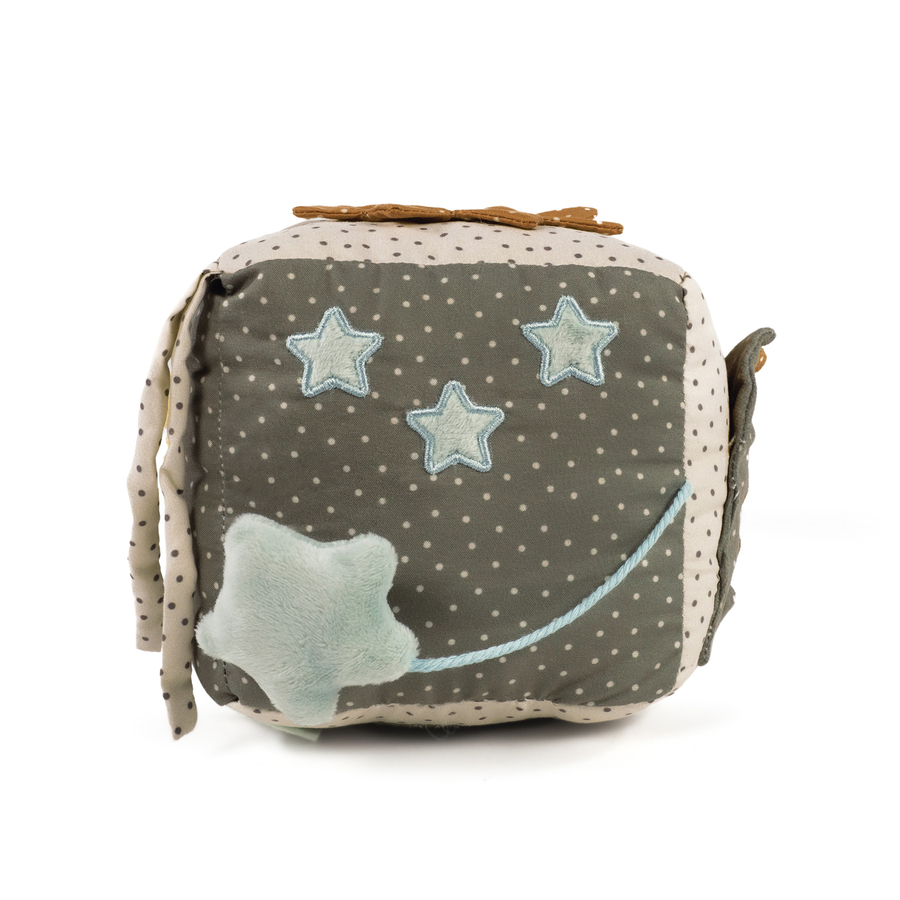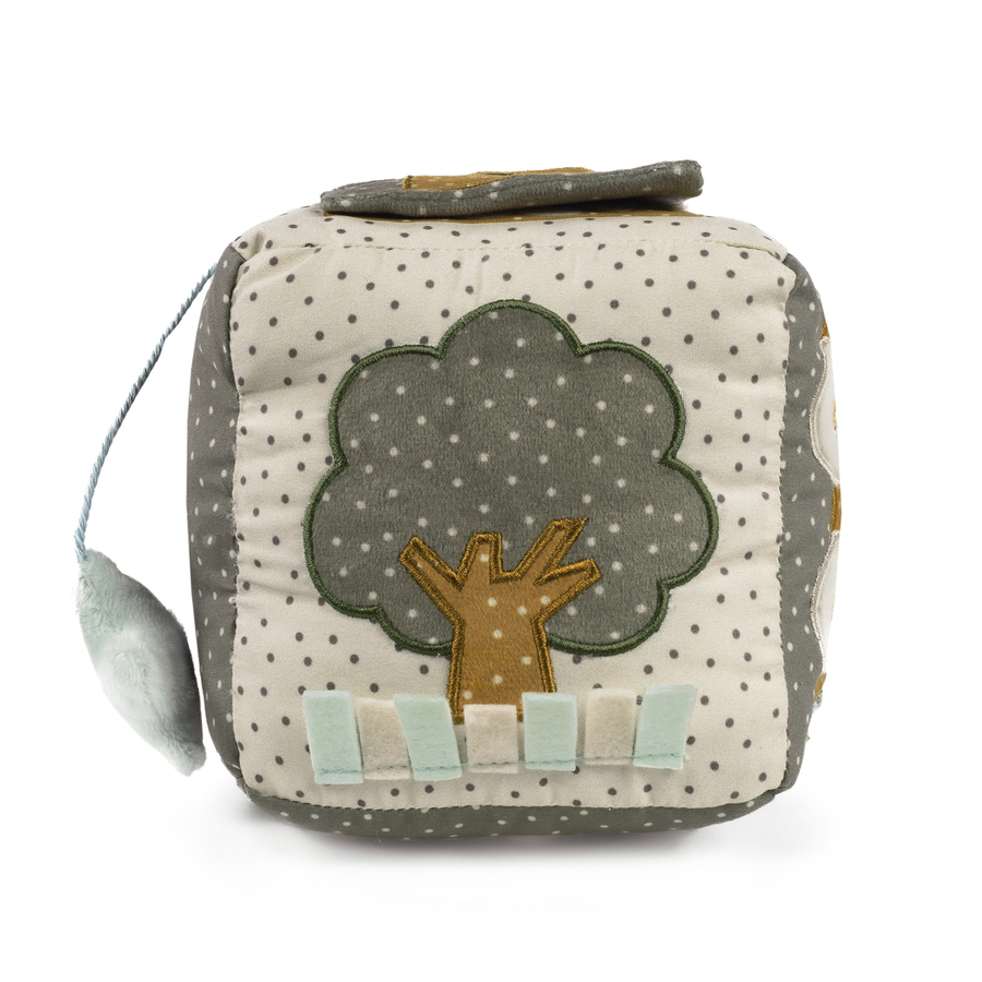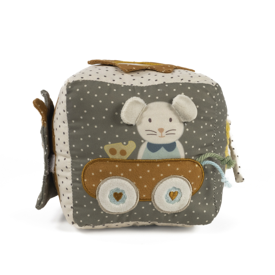 Con un encantador ratoncito y un trozo de queso en una de sus caras, este cubo está lleno de detalles atractivos y colores suaves que estimulan la vista del bebé.