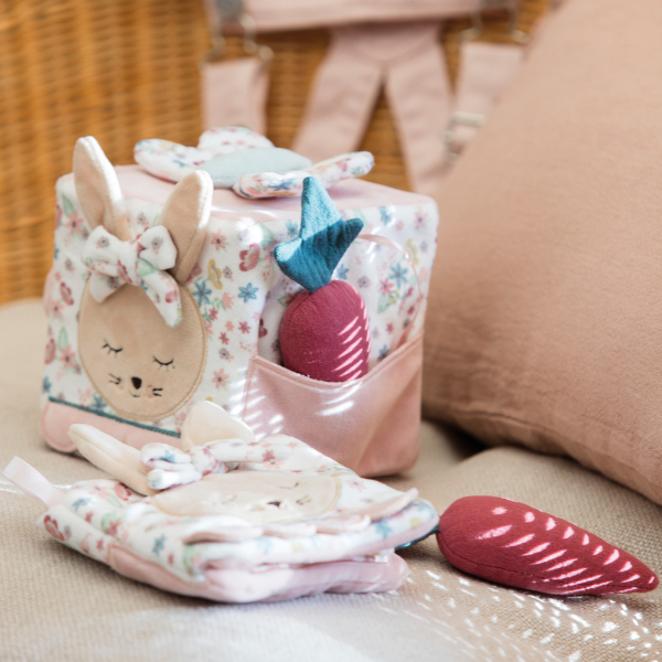 Cubo de actividades suave y blandito, en color rosa, lleno de detalles bonitos. Cuenta con distintos peluches que ayudarán a estimular a tu bebé: un conejita, una mariposa, una zanahoria y una flor con espejo para el autodescubrimiento.