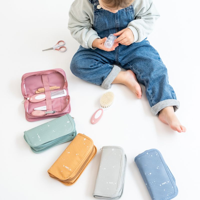 Completo neceser con todo lo necesario para el aseo del bebé en un práctico estuche con cremallera.