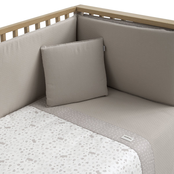 Juego de dos piezas para vestir la cuna, compuesto por una funda nórdica y un protector, además de un cojín decorativo. La funda nórdica es la pieza que cubre la cuna y protege al bebé del frío, proporcionando comodidad y calidez gracias a su relleno, ideal para los primeros meses de vida. Su relleno extraíble la convierte en una prenda versátil, adecuada tanto para invierno como para verano, y facilita su lavado. El protector, fabricado con un tejido acolchado con fibra hueca, ayuda a amortiguar los posibles golpes del bebé contra la cuna.