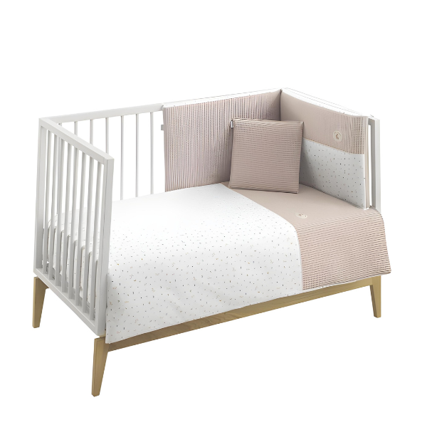 Juego de dos piezas para vestir la cuna, compuesto por una funda nórdica y un protector, además de un cojín decorativo. La funda nórdica es la pieza que cubre la cuna y protege al bebé del frío, proporcionando comodidad y calidez gracias a su relleno, ideal para los primeros meses de vida. Su relleno extraíble la convierte en una prenda versátil, adecuada tanto para invierno como para verano, y facilita su lavado. El protector, fabricado con un tejido acolchado con fibra hueca, ayuda a amortiguar los posibles golpes del bebé contra la cuna.