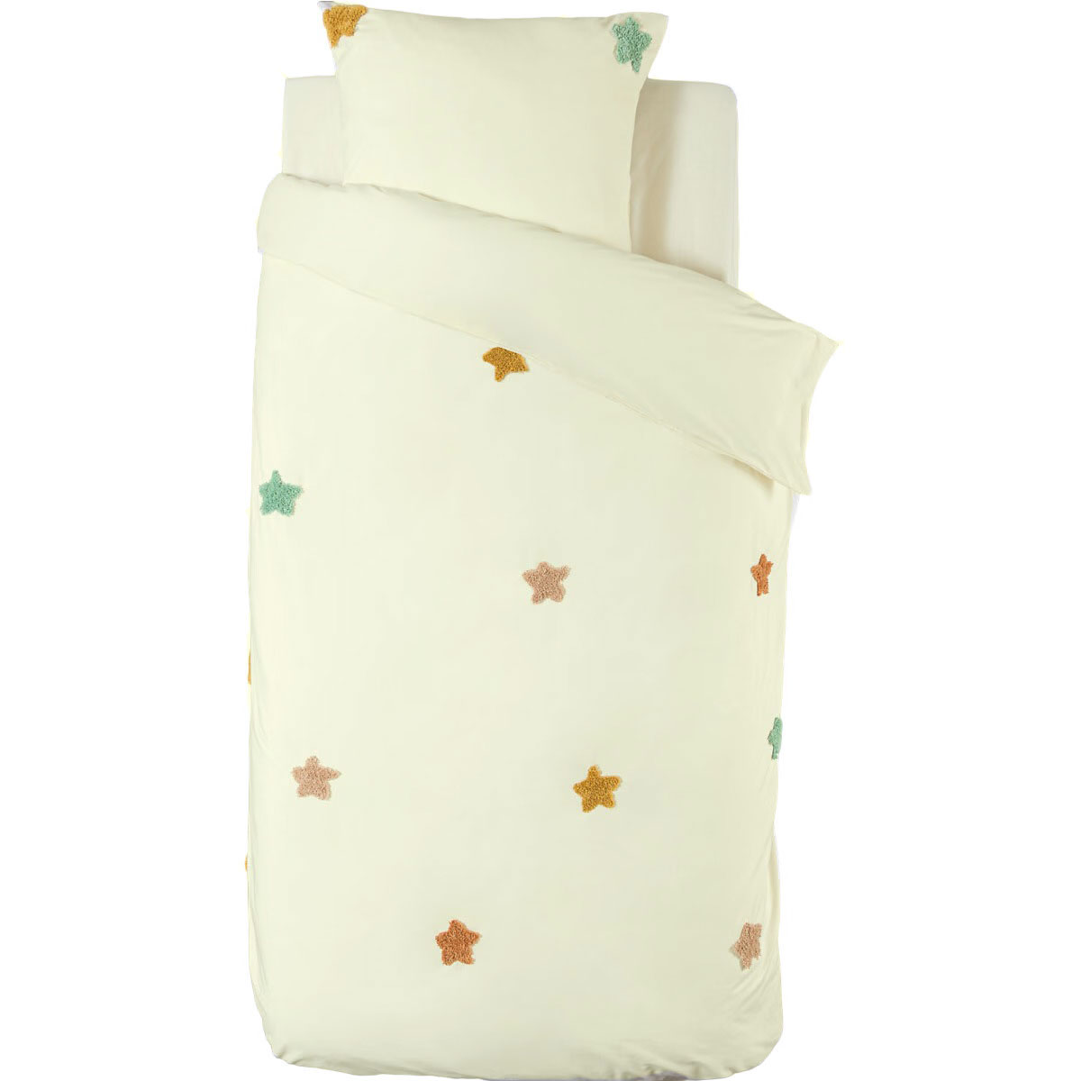 Juego de funda nórdica y almohada con estampado de estrellas. Sus colores en tonos pastel, te permitirán combinar la funda con cojines en los mismos tonos y en materiales naturales.