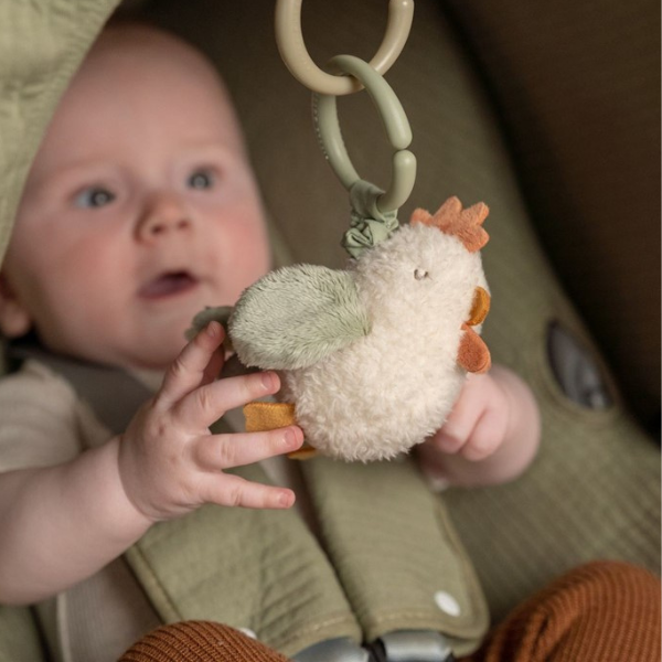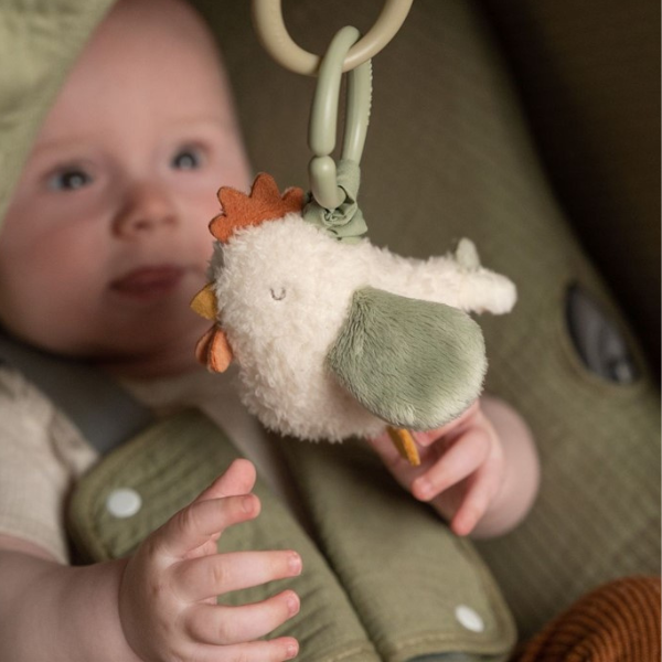 Coloca esta simpática gallina en un cochecito, hamaca o parque infantil, estira de ella y empezará a moverse hacia arriba. A tu bebé le encantará.