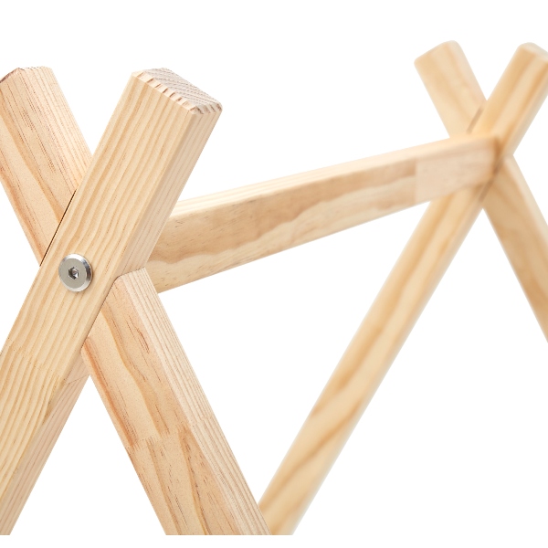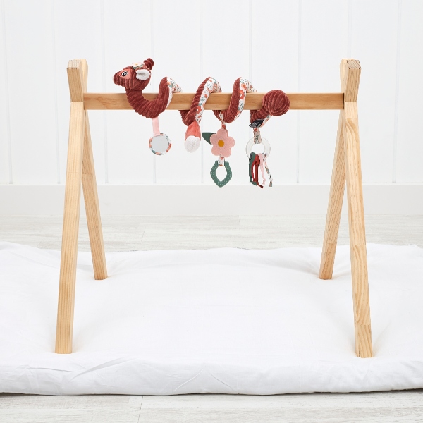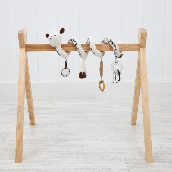 Sencilla estructura fabricada en madera de pino perfecta para estimular las habilidades visuales y motoras de los bebés. Se puede completar con peluches colgantes o espirales de actividades (no incluidos) para fomentar el aprendizaje y estimular los sentidos y la coordinación.