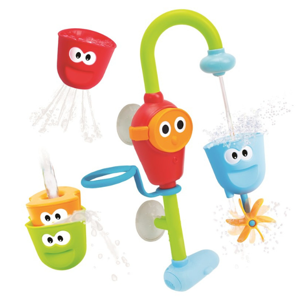 Adhiere el grifo a la bañera para que tu peque se divierta durante la hora del baño, y es que este juego ofrece distintas maneras de jugar en el agua. El agua entrará por el grifo y creará una corriente constante. Incluye tres vasos intercambiables y que cada uno de ellos tiene un chorro distinto. Los vasos se pueden apilar o usarlos individualmente. El brazo del grifo se puede girar y permite poder colocar los vasitos fácilmente. Es fácil de encender y apagar para los peques, solamente hay que pulsar la cara que funciona mediante pilas (no incluidas.)