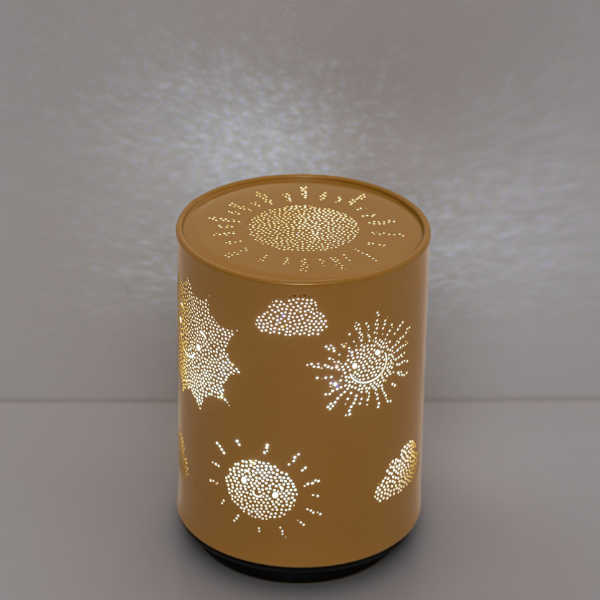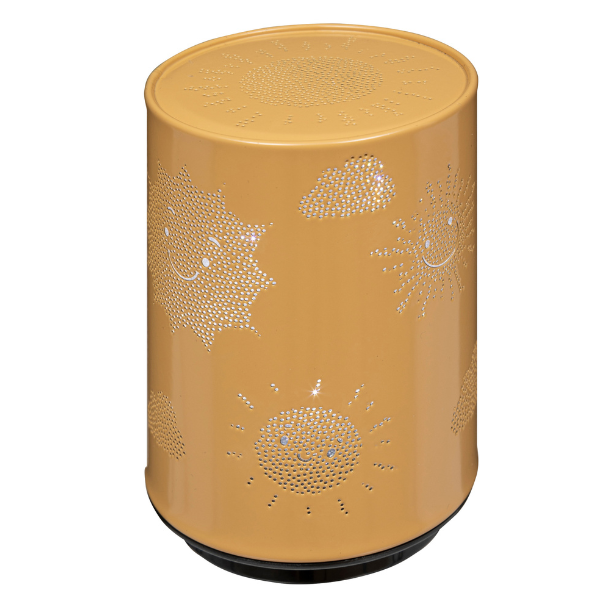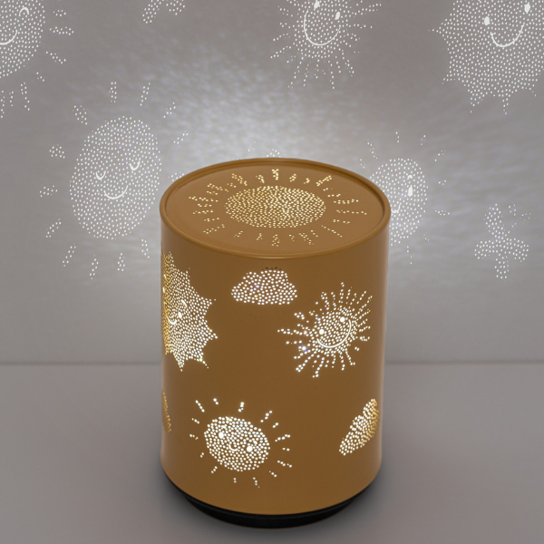 Lámpara infantil con un original diseño troquelado de soles y nubes. Enciende la lámpara pulsando la parte superior y observa como se refleja la luz en la pared. A tu peque le encantará y le acompañará en sus momentos de sueño y descanso.