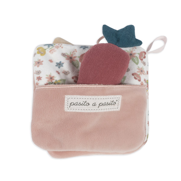 Libro de actividades suave y blandito, en color rosa, lleno de detalles bonitos. Es ideal para estimular a tu bebé con los distintos tactos y sonidos que ofrece.
